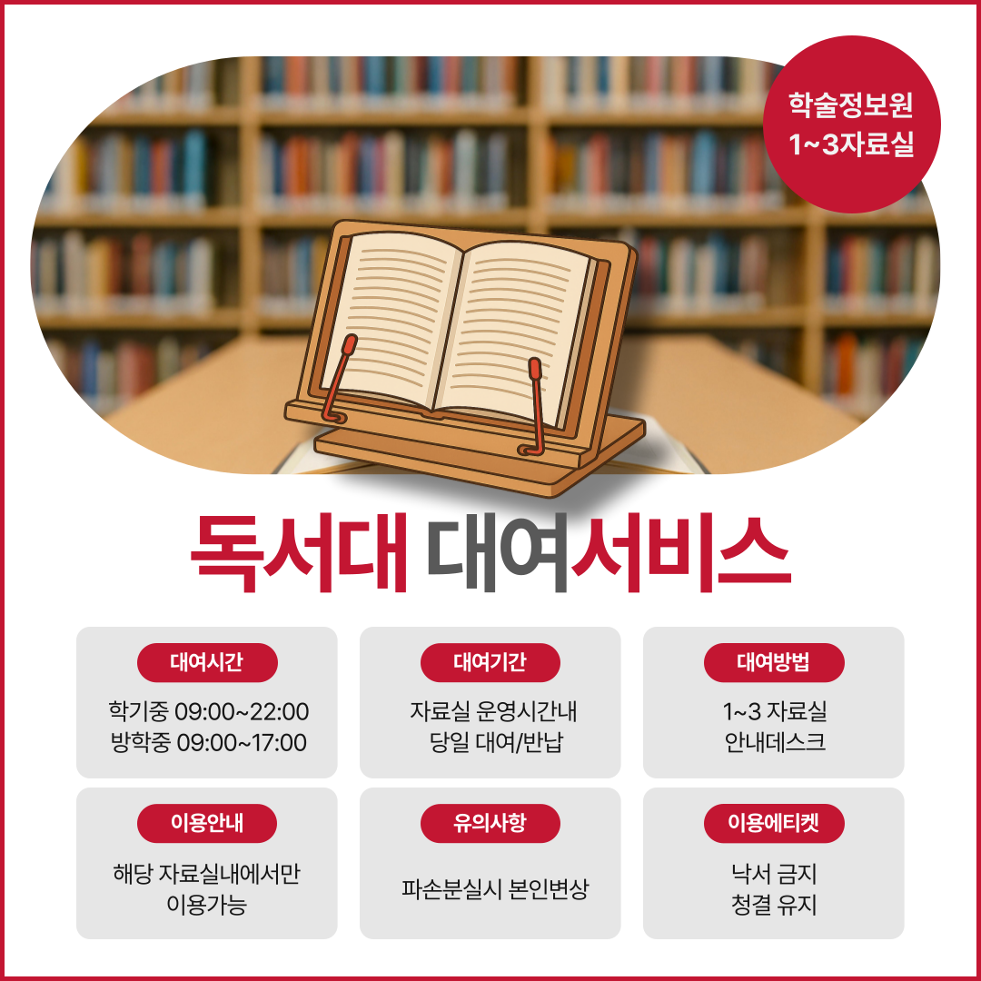 2) 학술정보원 자료실 이용 마감 시간 전까지 대여했던 안내데스크에 꼭 반납하고 가시기를 바랍니다.
