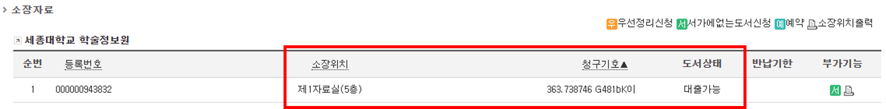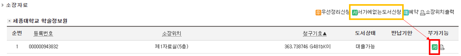 ※ '서' 초록 아이콘이 없다면 해당 도서는 이미 서가에 없는 도서 신청 중인 상태입니다.